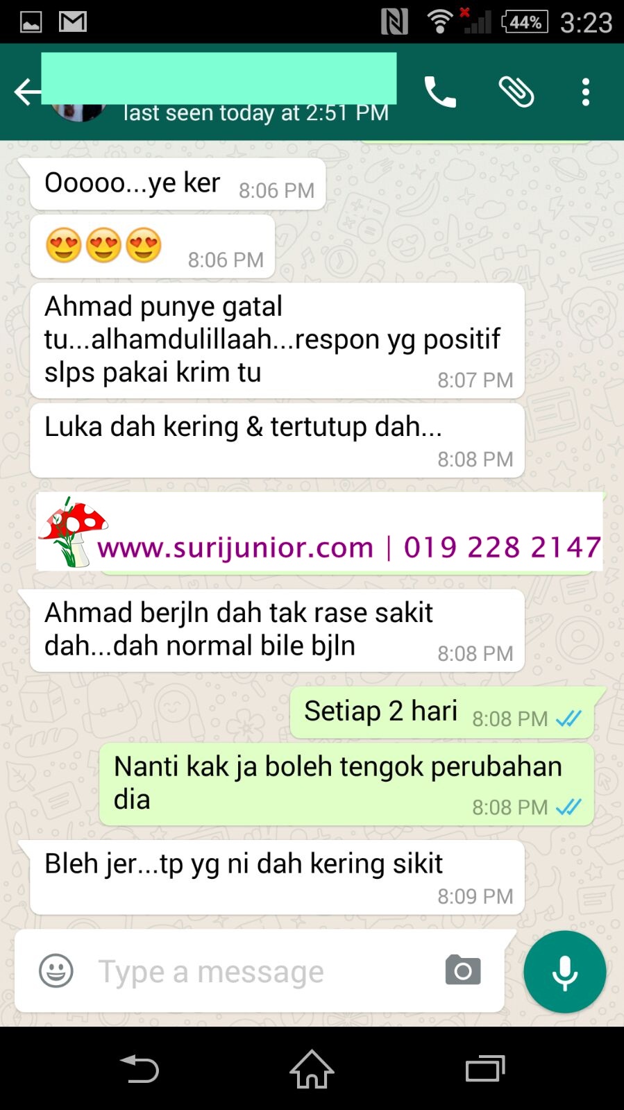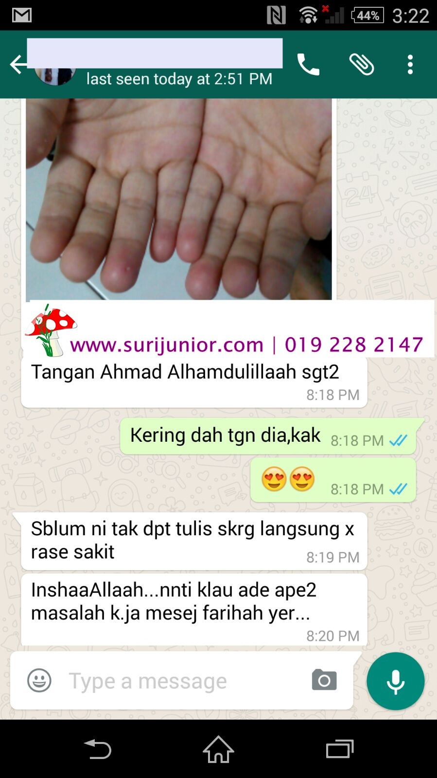 Tak sampai 3 hari guna, ibunya dah beritahu saya melalui whatsApp, anaknya, Ahmad dah pun pulih sepenuhnya eczema di tapak tangan. Tinggal bahagian tapak kaki sahaja. Sebelum ini, eczema Ahmad mengganggunya untuk berjalan dan menulis dengan baik. Kesian kan.