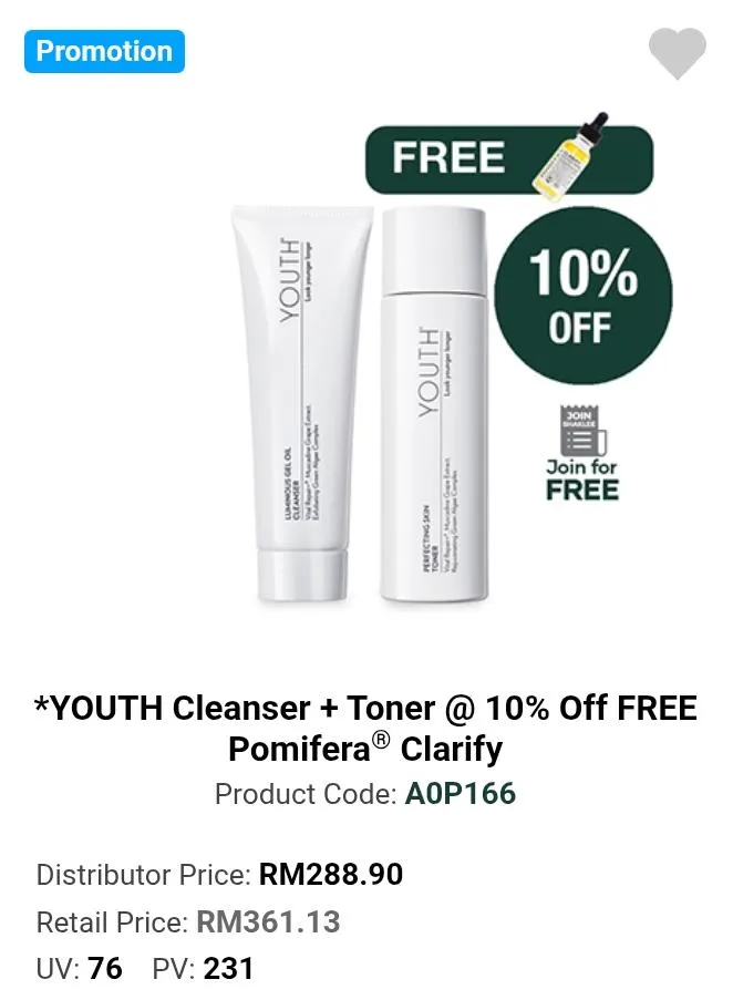 YOUTH CLEANSER + TONER @ 10% OFF FREE POMIFERA CLARIFY